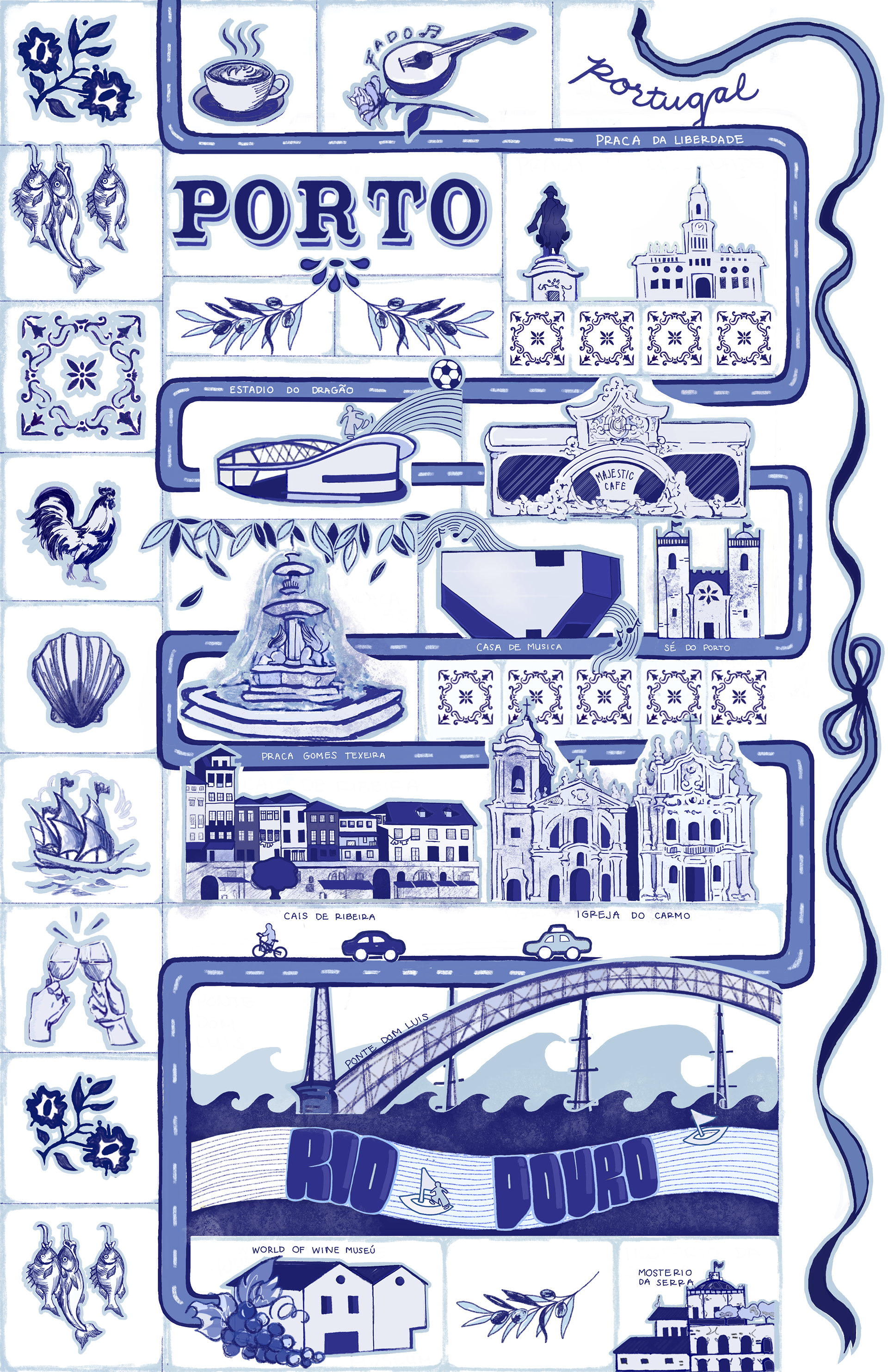 I created a digital illustrated map of Porto, Portugal, during Spring semester of my Sophomore year at Cornish. The design was inspired by the city’s historic azulejo tiles, which I used as a recurring motif.