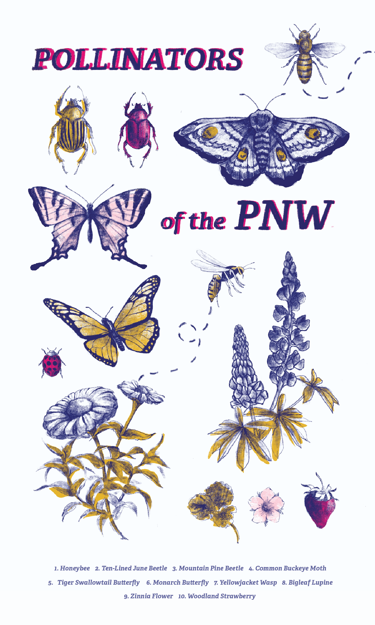 I created a tri-color print using traditional lithography. The piece highlights key pollinator species in the PNW, combining educational content with detailed, hand-drawn illustrations.